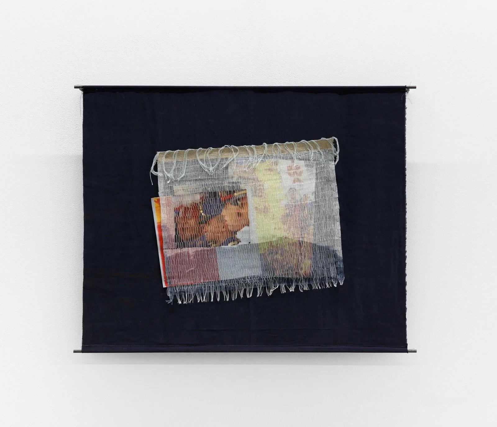 Almost like stages of perception, these works, whether mounted on metal boxes, or subtly landing on metal rods, investigate a world of references torn by the action of a blade and rebuilt on the loom in an assumed gesture of questioning the information systems from which all humans in modern times depart from and navigate within.